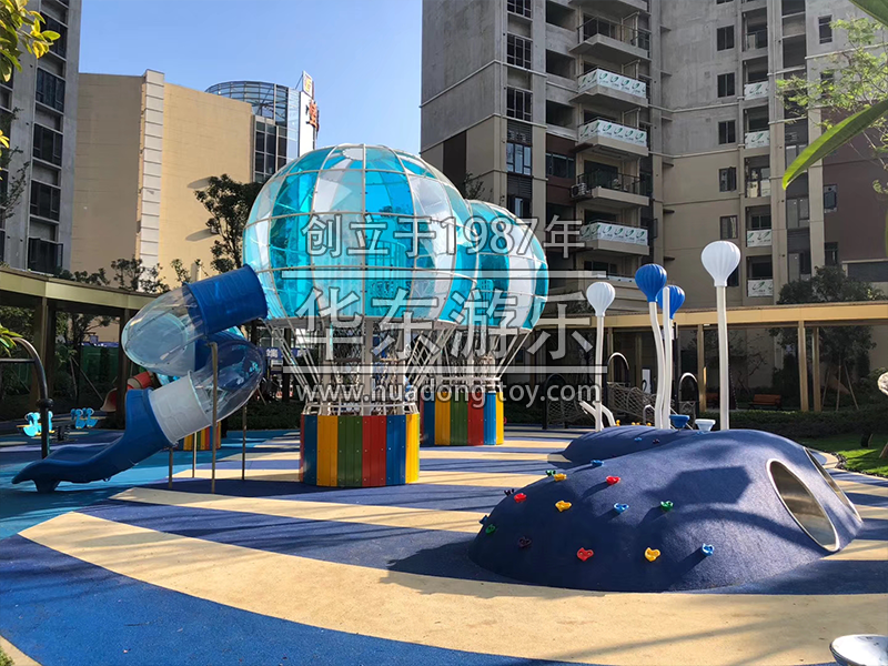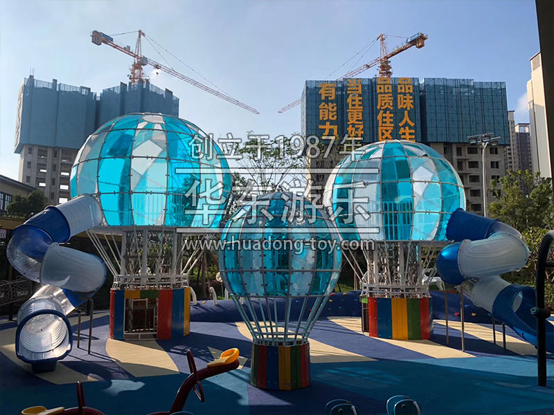 该项目采用的是以热气球为设计思路而设计的游乐场,场内设计了爬网,大型滑梯组合,秋千等等游乐设备。