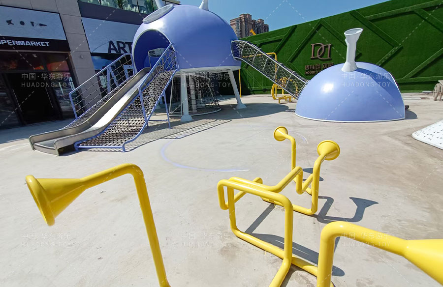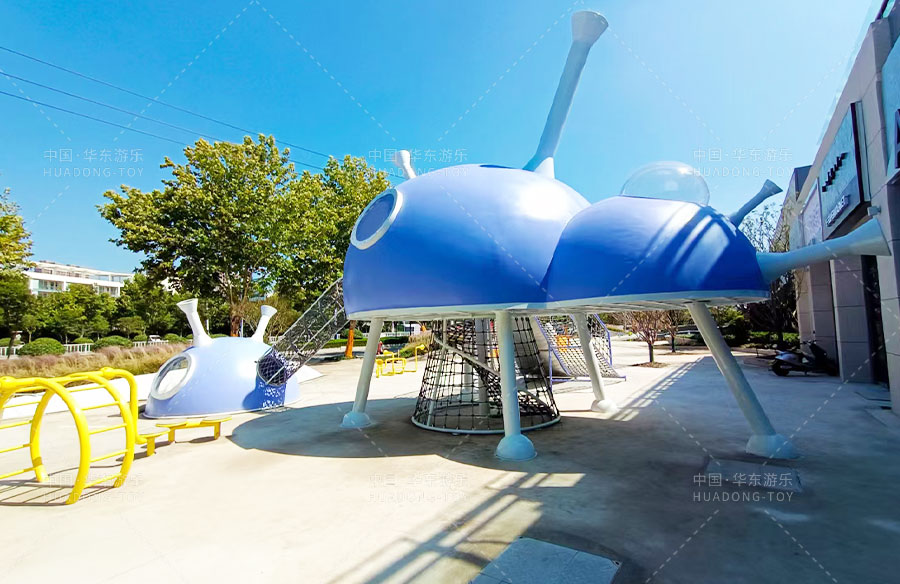 此次项目采用的是乐鱼leyu游乐自主设计的飞碟主题的游乐设备,新增了传声筒、爬网、儿童秋千、钻洞、不锈钢滑梯等功能。