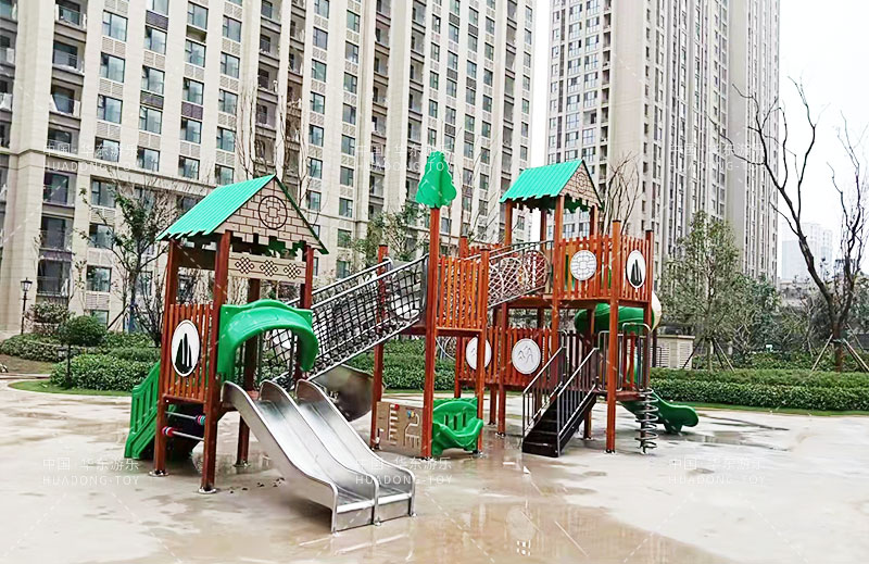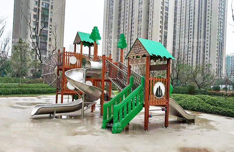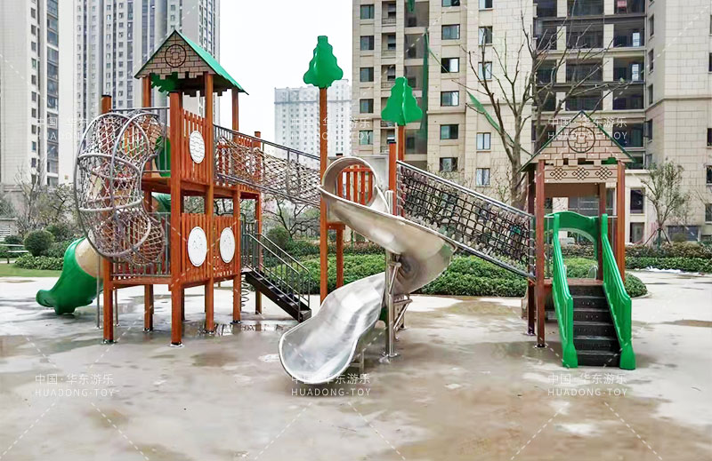 荣盛华府选用的是乐鱼leyu游乐自主设计的具有攀爬网、U型爬网、不锈钢滑梯、网桥、滑桶为一体的综合性游乐设备。