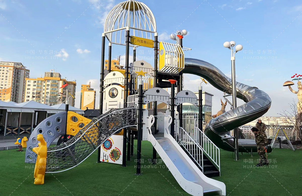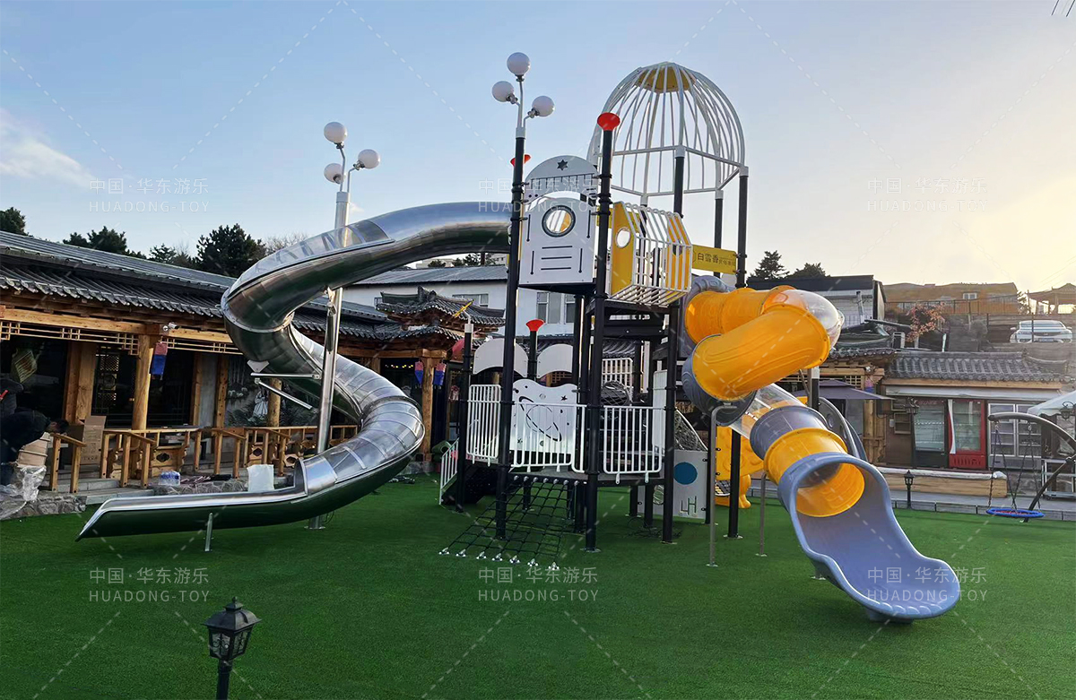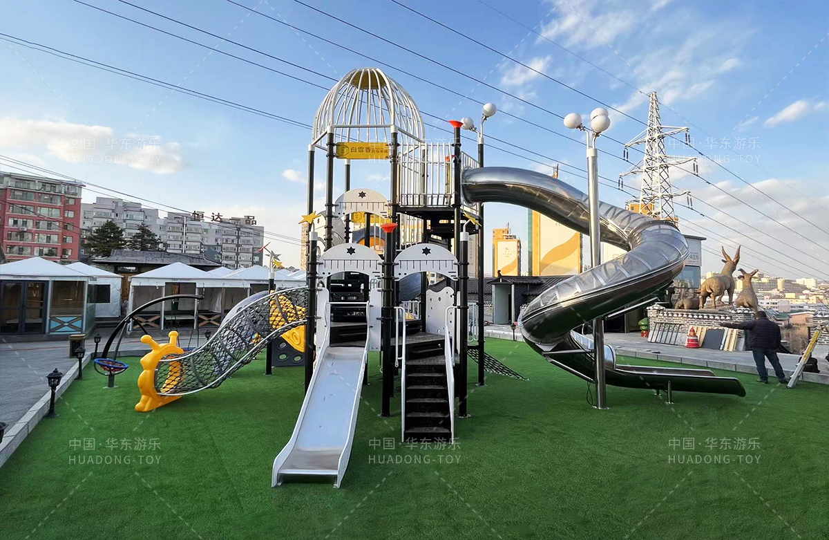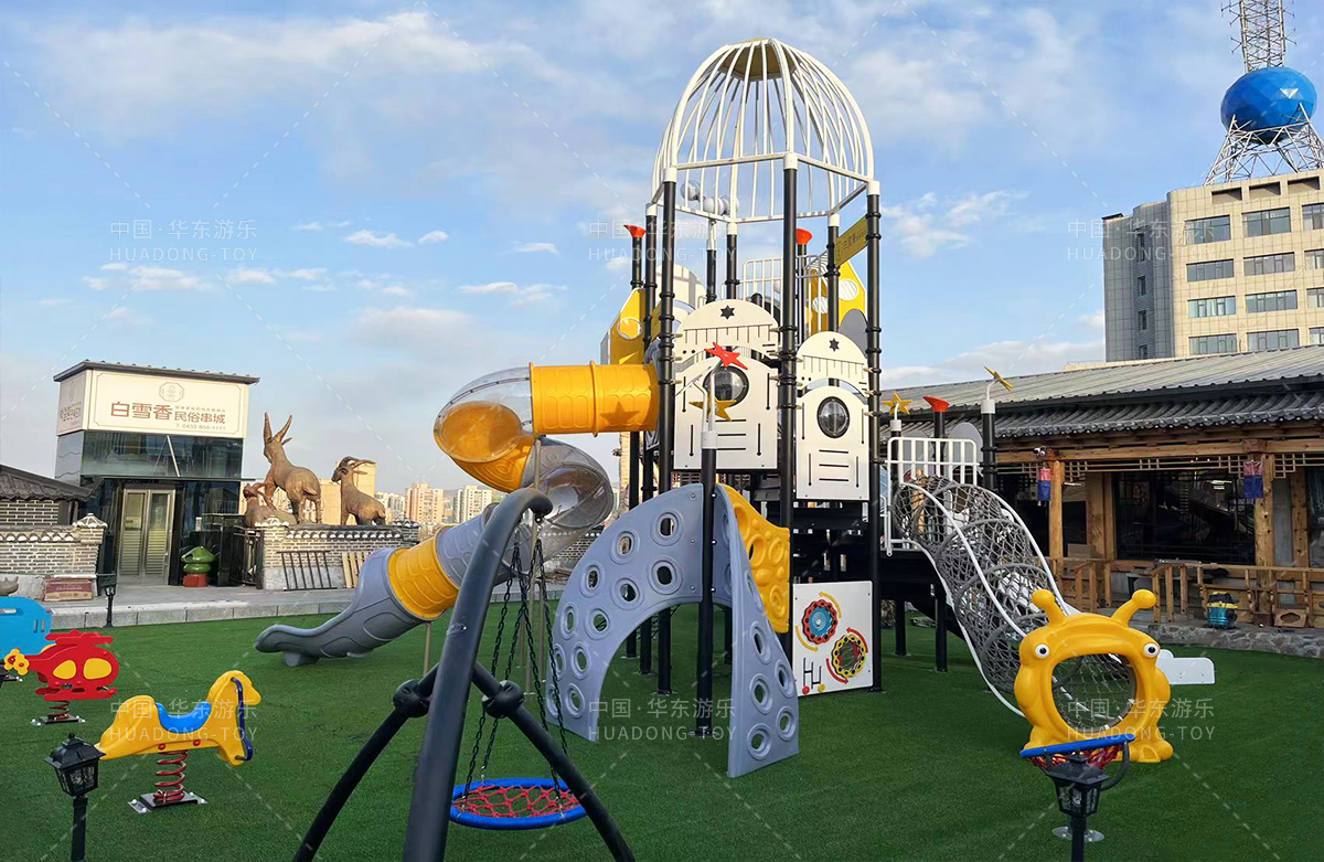 吉林省白雪香民俗烧烤城是一个专业的休闲夜宵烧烤城,此次选用的是乐鱼leyu游乐自主研发和设计的 PE板系列滑梯,卡通的造型,齐全的功能深受小朋友们的喜爱,同时还设置了小朋友喜欢的儿童摇摇乐、组合秋千、 旋转碗等游乐设备。