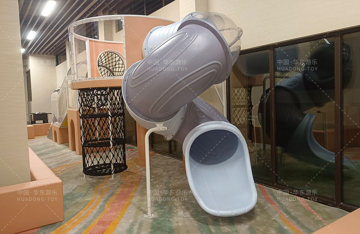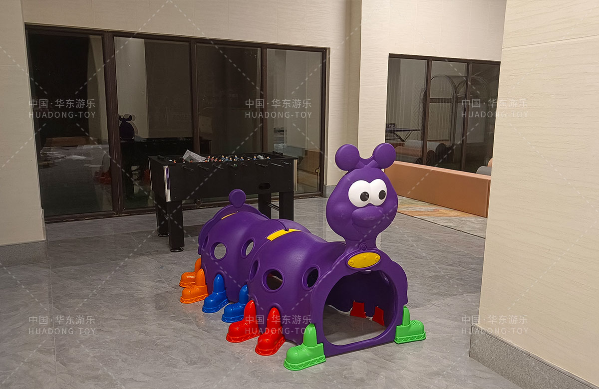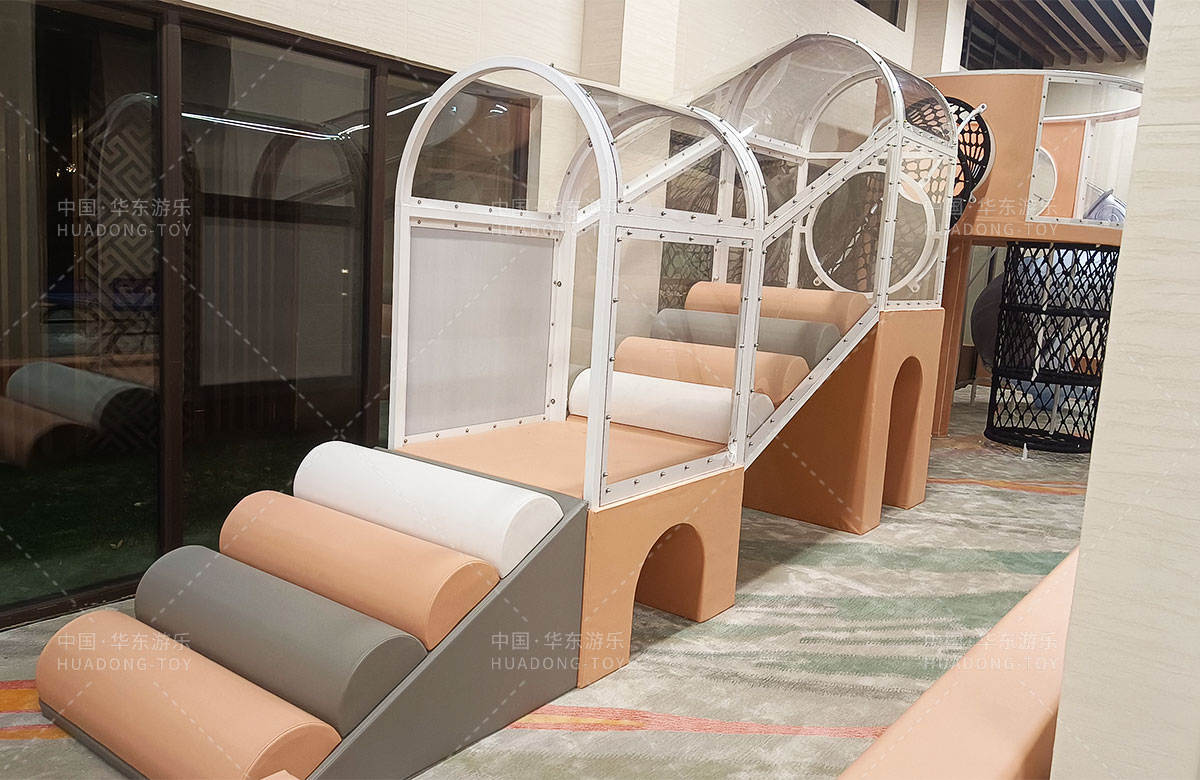 该项目选用的是乐鱼leyu游乐生产的室内淘气堡系列产品,整套设备集合了攀爬网、钻洞、攀爬梯、旋转滑筒等功能,除此之外还设置了小朋友们喜欢的毛毛虫钻洞,儿童台球、乒乓球、桌面足球等设备,让整个售楼处变得更加的充满生机与活力。