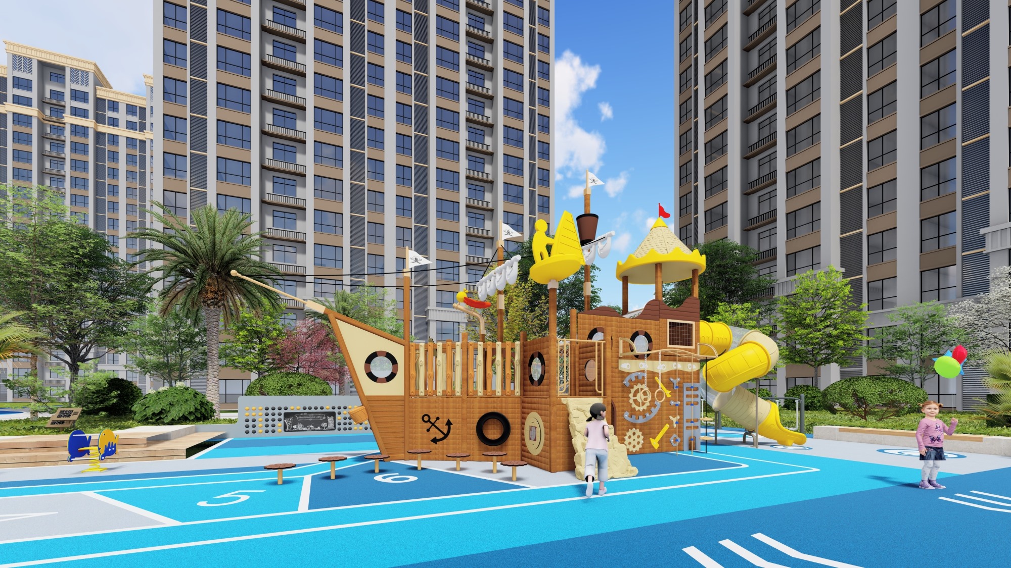 木质海盗船组合滑梯的设计以大自然为主题,融合了船体、桅杆、甲板等元素,外观新颖、结构牢固。它集攀爬、滑梯、秋千等功能于一体,旨在锻炼孩子的平衡协调能力和自我保护意识,同时培养探险精神。